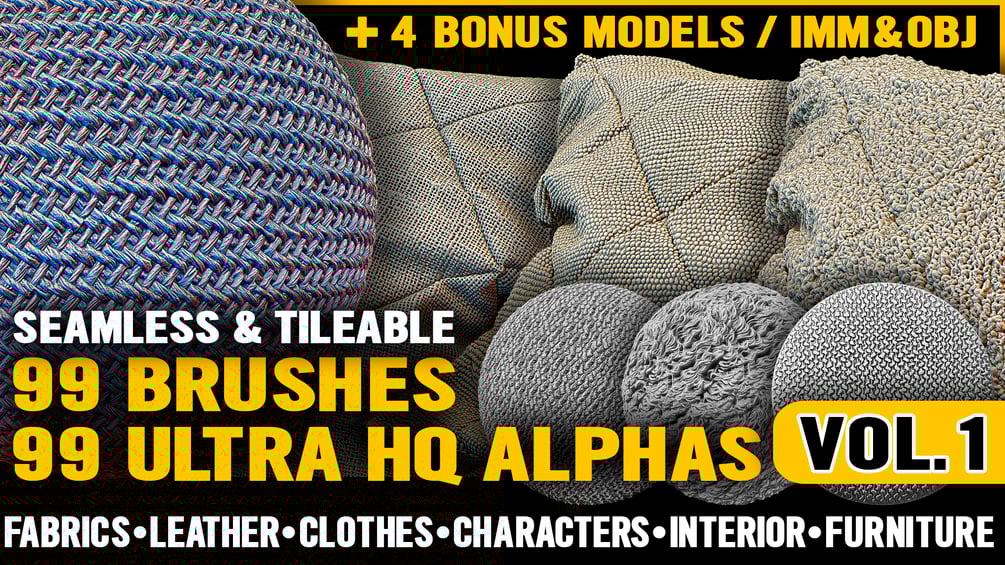 99 Ultra HQ Fabric & Leather Seamless Sculpt Zbrush brushes + 99 Alphas (Blender, Substance, etc.) Vol.1