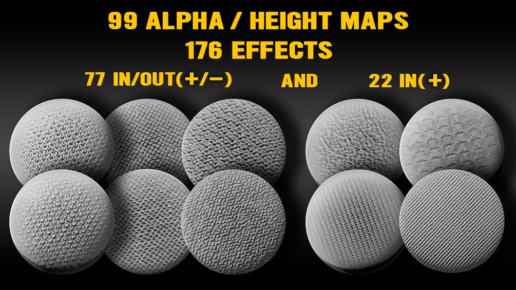 - 99 Zbrush alpha brushes (.ZBP) (77 ADD/SUB + 22 ADD)